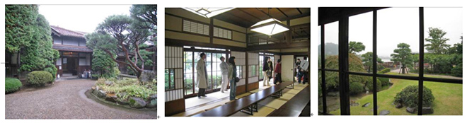 門を入ると真中に大きな杉の木が迎えてくれる。「砂丘館」と感じがよく似ている。全体にちょっと大きいかなという感じ。中庭のサザンカとつつじが素晴らしい。定例に市民茶会が開かれていると云う。