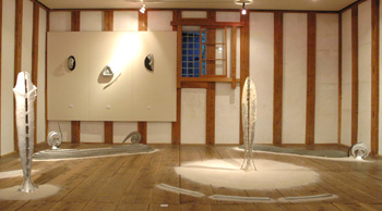 またアルミの鋳物片を連結して造形する一連の作品群は、鋳金というソリッドのアートからの脱出を図る意図が感じられる。あるときは羽根が空気を抱え込むような表情だったり、風に打たれる水面のさざ波の趣だったりという具合で、金属がどこまで空気と軽やかな戯れを演じることができるかの挑戦のようだ。