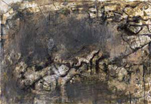 デカルコマニーの誕生と並行して、飯田の油彩の世界にはヌードを重く、褐色の画面に塗り込め、見ることの不思議な体温を画肌に染みとおらせたような「地霊」シリーズが生まれてきた。その後のスペイン旅行と、旅で見た荒々しい自然や北蒲原の風土に触発されながら、重く熱い蠕動を今も続ける油彩の大作と90年代のデカルコマニーを砂丘館で、最近作を羊画廊で同時期に展観する。