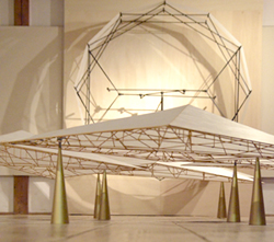 出発点は和紙と竹だった。模型飛行機作りに夢中だった少年は、大人になって翼によく似た作品を作り始めた。やじろべえのように均衡を保つ、羽のような作品は、人が歩いて起こるほどのわずかな空気の流れにも呼応して浮かぶように揺れ、和紙はほのかに光を透かせて半透明の影を作りだす。それはおよそ「彫刻」のイメージから隔たった軽やかな造形だ。