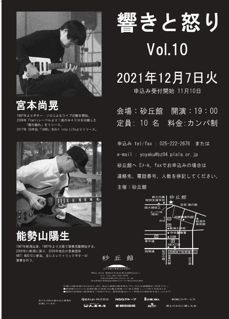 「響きと怒り」は 宮本尚晃と能勢山陽生の それぞれのギターソロ演奏を 行う二人会です。 年1回砂丘館と落合SOUPで行われ、 今回で開催10回目を迎えます。 調、エンターテイメント性、コマーシャリズム、 を排除し、そ…