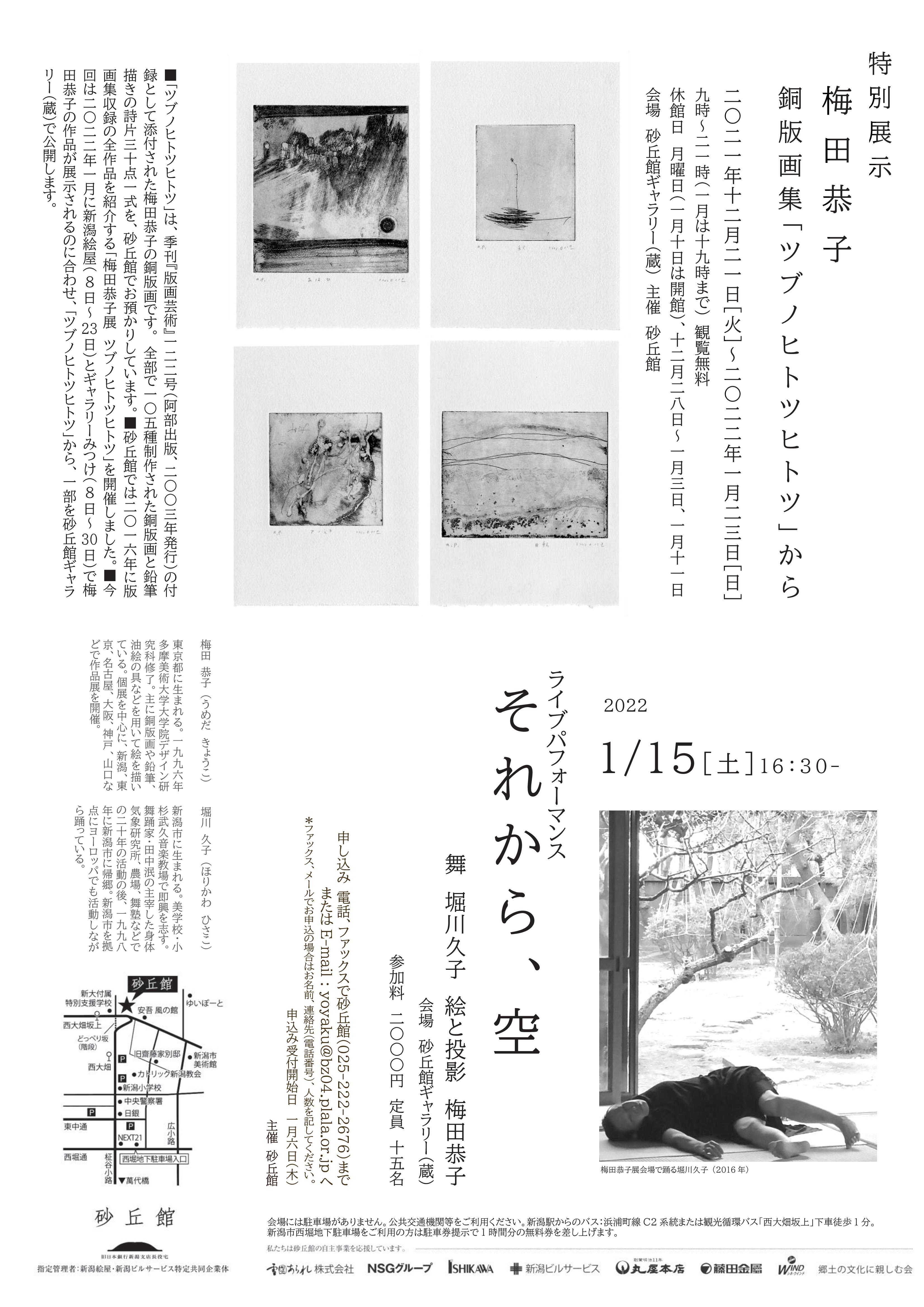 展示会場にて梅田恭子・堀川久子によるパフォーマンス 舞 堀川久子,絵と投影 梅田恭子 会場:砂丘館ギャラリー(蔵) 日時:2022年1月15日(土)16時30分~ 定員:15名 → 10名(新型コロナウイ…