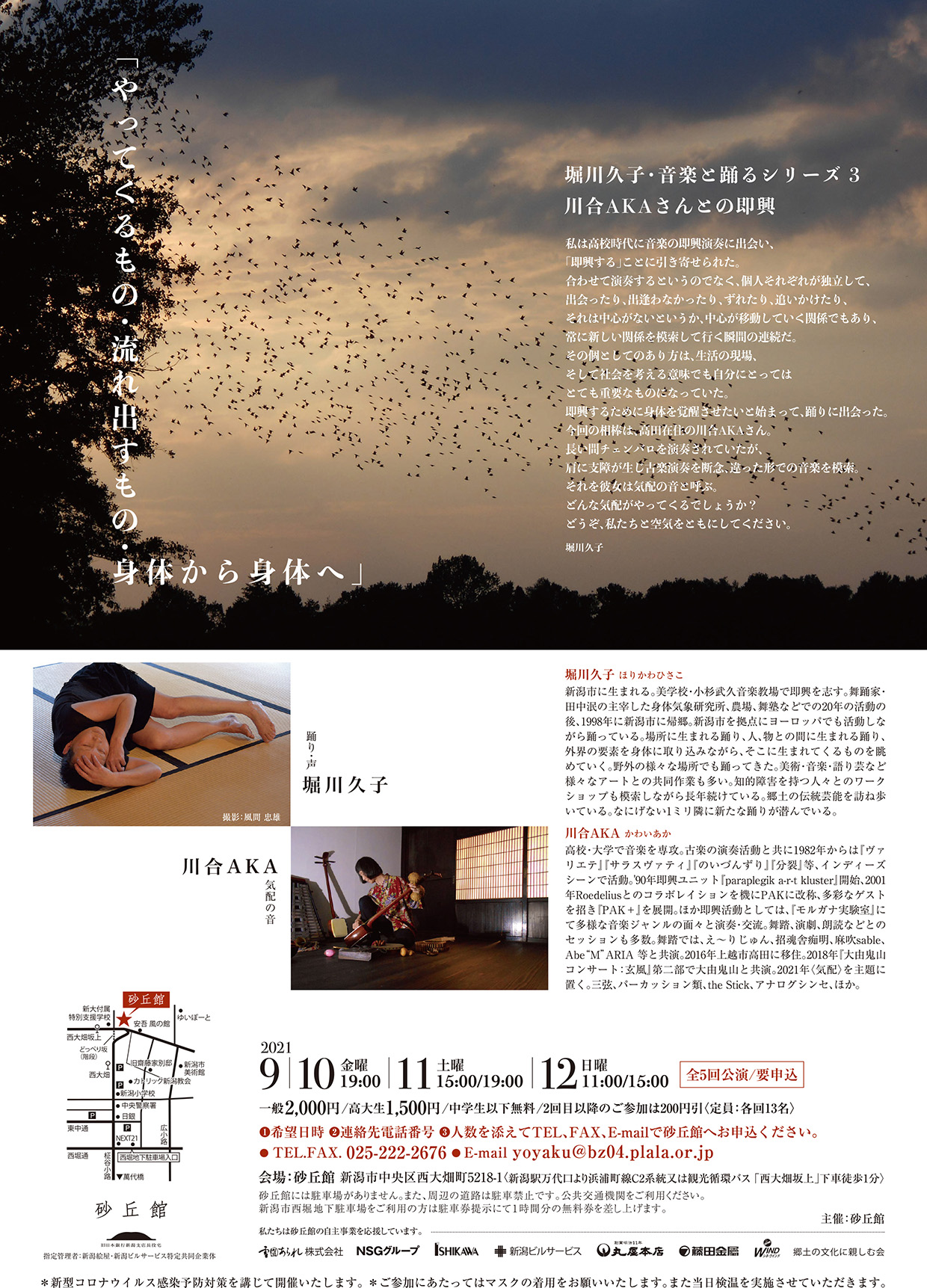 新型コロナウイルス感染拡大への対応として砂丘館が臨時休館(9/3-16)するため、本公演を中止いたします。12月ごろに同じ出演者による公演を予定しています(ホームページ等で改めてお知らせいたします)。 &n…