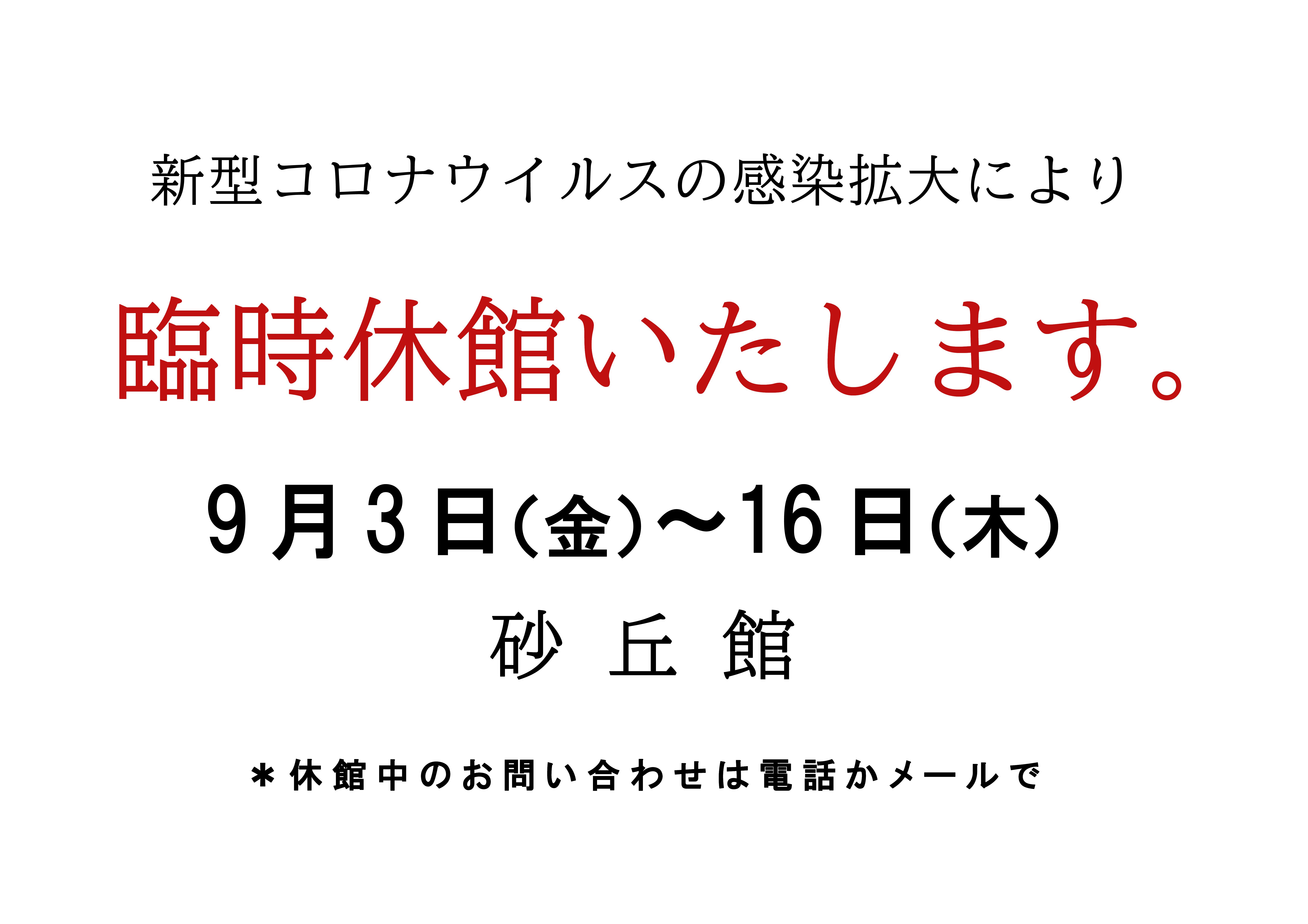 新型コロナウイルスの感染拡大が収まらない事態への対応として、新潟市の施設は9/3~16まで休館になります。 砂丘館も臨時休館となります。 なお臨時休館中は、お電話またはメールでお問い合わせに対応いたします。 電話025-…
