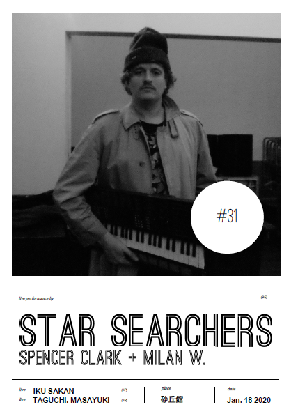 live: Star Searchers (Spencer Clark + Milan W.) Iku Sakan TAGUCHI, Masayuki 前売2500円 / 当日3000円 / 県外2000円 / 18才以…