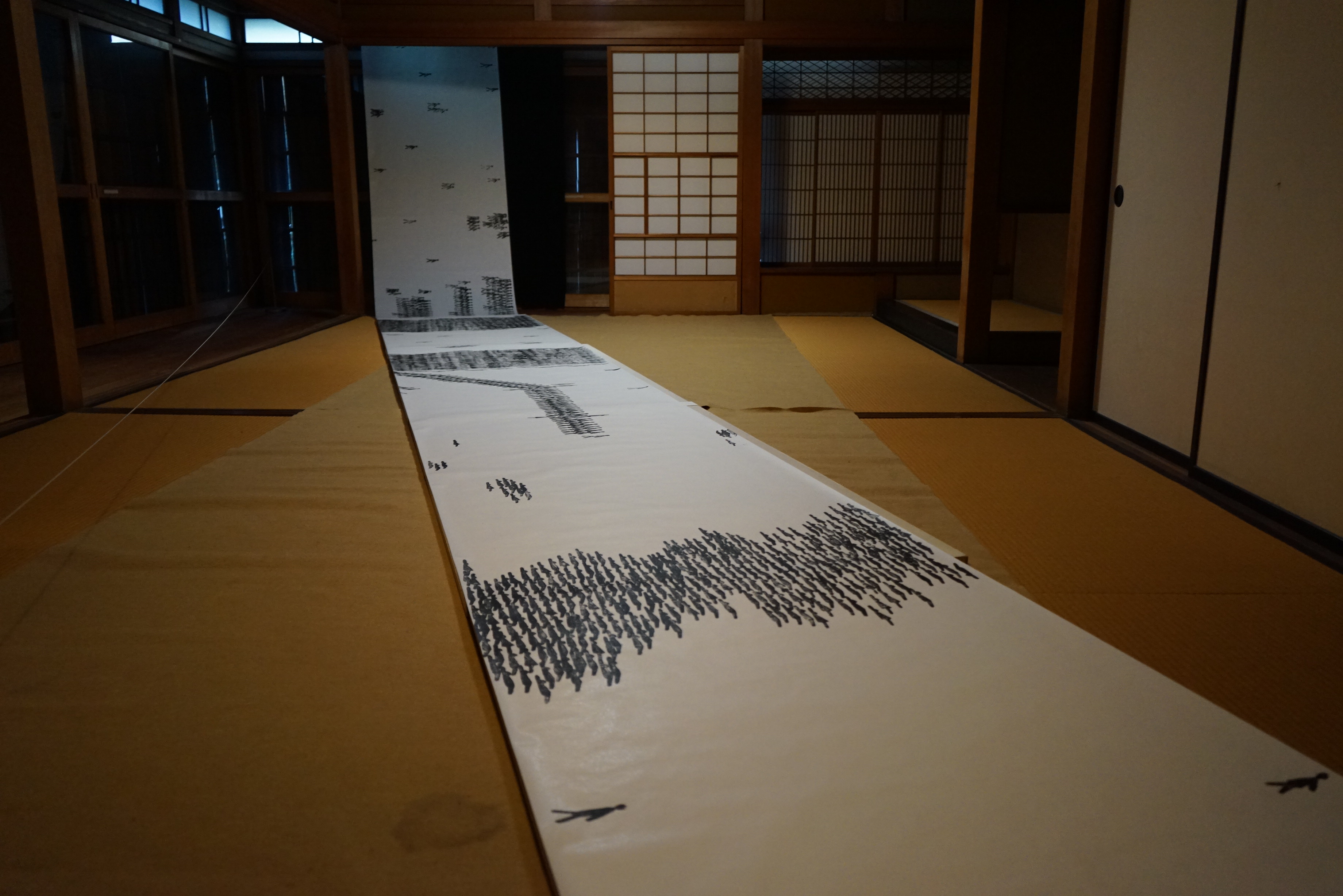 三重の版画家久保舎己が2022年に制作した長さ10メートルの木版画「ひとがゆく」を新潟絵屋での久保舎己展開催に合わせて展示します。 数種類の版で捺された人が、空白の世界を歩きだし、集り、群れ、離れ、倒れ、立ち上がり、また…